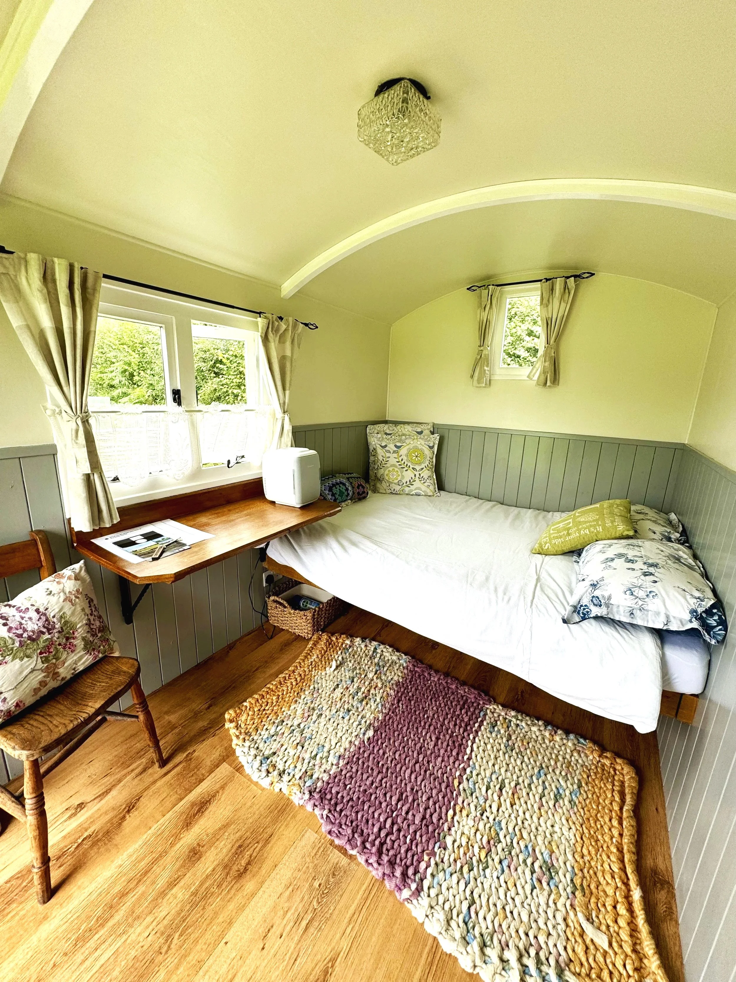 Our original glamping hut is the perfect place to stay for a solo traveller and pooch, or the adventure seeking couple looking to get out and about across the wild Cornish moors each day. Complete with fold out double bed, fridge, electric wood burner, kettle and covered lean-to for evening barbecues, our Shepherds hut does it all! Scroll down for more information…